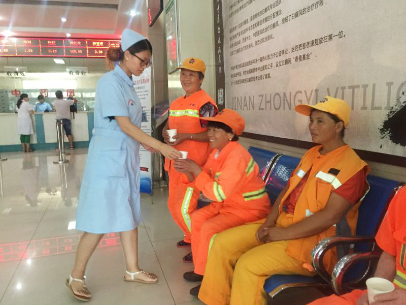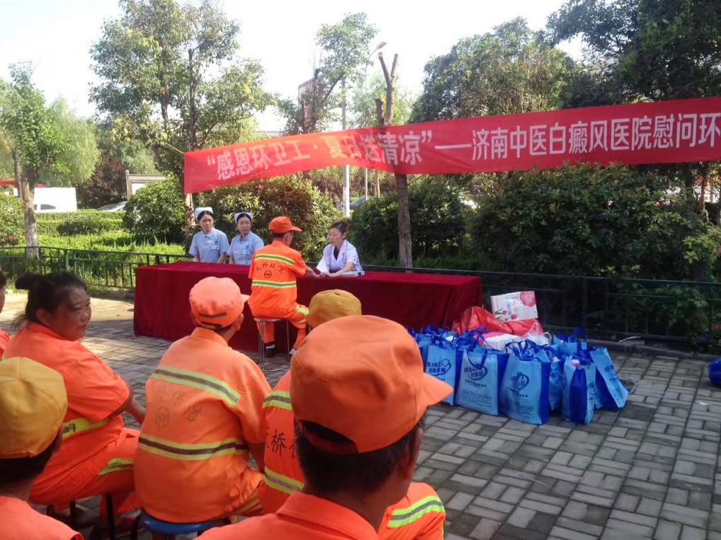 众所周知,环卫工人们工作环境灰尘较大、常受日晒雨淋、工作繁重,这种环境容易导致一定健康风险的存在,为此,济南中医白癜风医院环卫工人进行皮肤病咨询。同时,周主任叮嘱大家在做好本职工作的同时,注意自身身体健康。