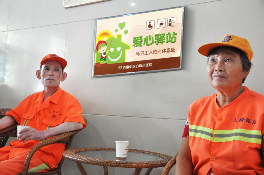 “高温天气的时候,有时自己带一瓶水不够喝,也不舍得花钱买水喝,只能忍着。”从事7年环卫工作的刘美云道出了大家的心声。记者在济南中医白癜风医院看到,医院专门为环卫工们设立了宽敞明亮的“爱心驿站”,这里除了饮水机、微波炉外,休息区内还放置有医药保健箱,配备常见防暑降温药品。