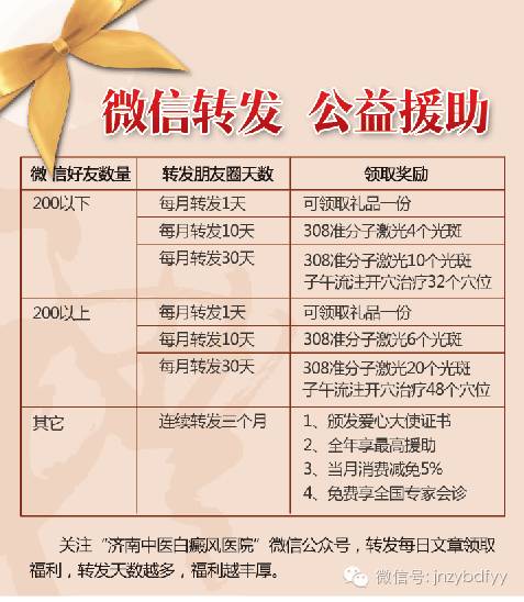 关注“济南中医白癜风医院”微信公众号,转发每日文章,领取礼品和就诊福利,微信好友越多,转发天数越多,福利越丰厚。